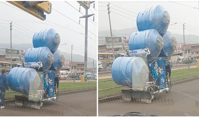 Hombre sorprende al trasladar 4 cisternas en mototaxi por una transitada carretera peruana