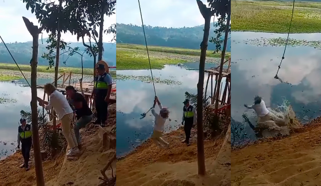 Mientras participaba en las actividades programadas, la funcionaria decidió intentar balancearse en una soga sobre la laguna El Ocoñal.