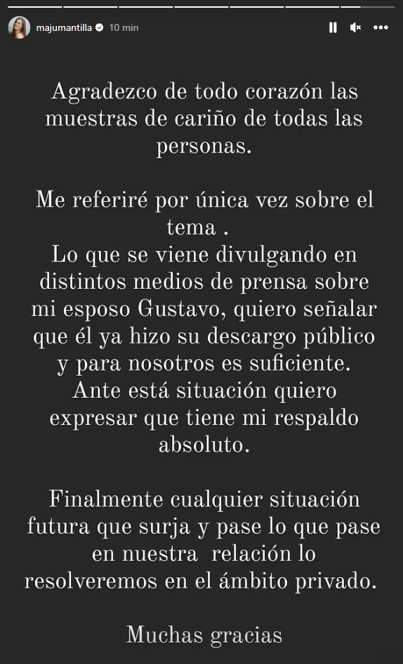 «Agradezco de todo corazón las muestras de cariño de todas las personas. Me referiré por única vez sobre el tema. Lo que se viene divulgando en distintos medios de prensa sobre mi esposo Gustavo, quiero señalar que él ya hizo su descargo público y para nosotros es suficiente. Ante esta situación, quiero expresar que tiene mi respaldo absoluto. Finalmente, cualquier situación futura que surja y pase lo que pase en nuestra relación, lo resolveremos en el ámbito privado. Muchas gracias», afirmó la conductora de TV.